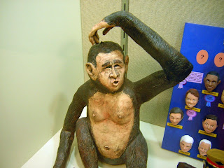 They put a call out for pieces of art at the Linn Benton Community College and, glory be, you’ll never guess: all of the pieces were Bush Bashing! Surprise! Now here’s a further surprise: most of those art pieces were BROUGHT IN BY THE SCHOOL FOR THE SHOW. It’s part of a traveling art show that, on some level, integrates student work. Imagine our shock and surprise! Now here’s another surprise: Most of the pieces have been taken down.