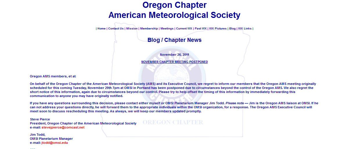 The Oregon American Meteorological Society’s event featuring Meteorologist Chuck Wiese, Climatologist George Taylor, and me on November 29 at OMSI was canceled at the last minute today due to pressure from local universities and others who were apparently upset that our skeptical perspective on Global Warming would interfere with their climate agendas and Federal funding.  Details will surely leak out as will whatever reasons they will cite as a cover story.