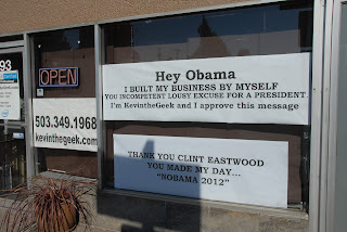 Kevin “The Geek” got an interesting customer yesterday at his Lake Oswego based business. A Dunthorpe doyenne entered his store, began berating the businessman for his anti Obama sign, and when he insisted he wouldn’t take it down, slapped him. He threatened to call the cops but she left and then shuffled across the street and lost herself in the stores and parking lot.