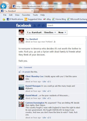 Here TA begins his profanity laced bile-spewing by likening non voters in Wisconsin election to people being killed in Syria.