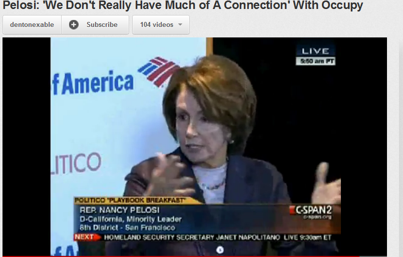 The woman who made her family millions with insider trading tips in Congress and who previously embraced Occupy SEIU AFL-CIO types, now distances herself from it. In front of a Bank of America sign to boot. Not so fast, Nance.