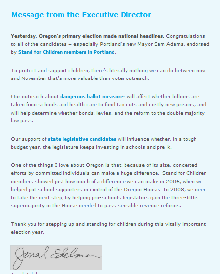 Stand for Children–which crowed about electing “pro school” (liberals) to office.
