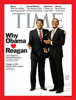 In spite of that, Time magazine’s upcoming issue features a photoshopped cover of Reagan embracing Obama and an article The Role Model: What Obama Sees in Reagan
